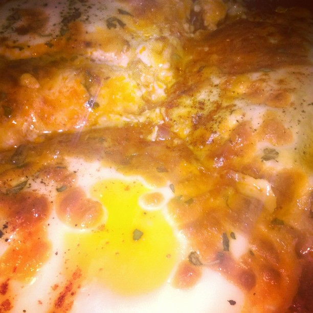 3. Bring to a simmer and break the eggs over the tomatoes. Gently break the yolks with a fork. (There is also an option to make the eggs).